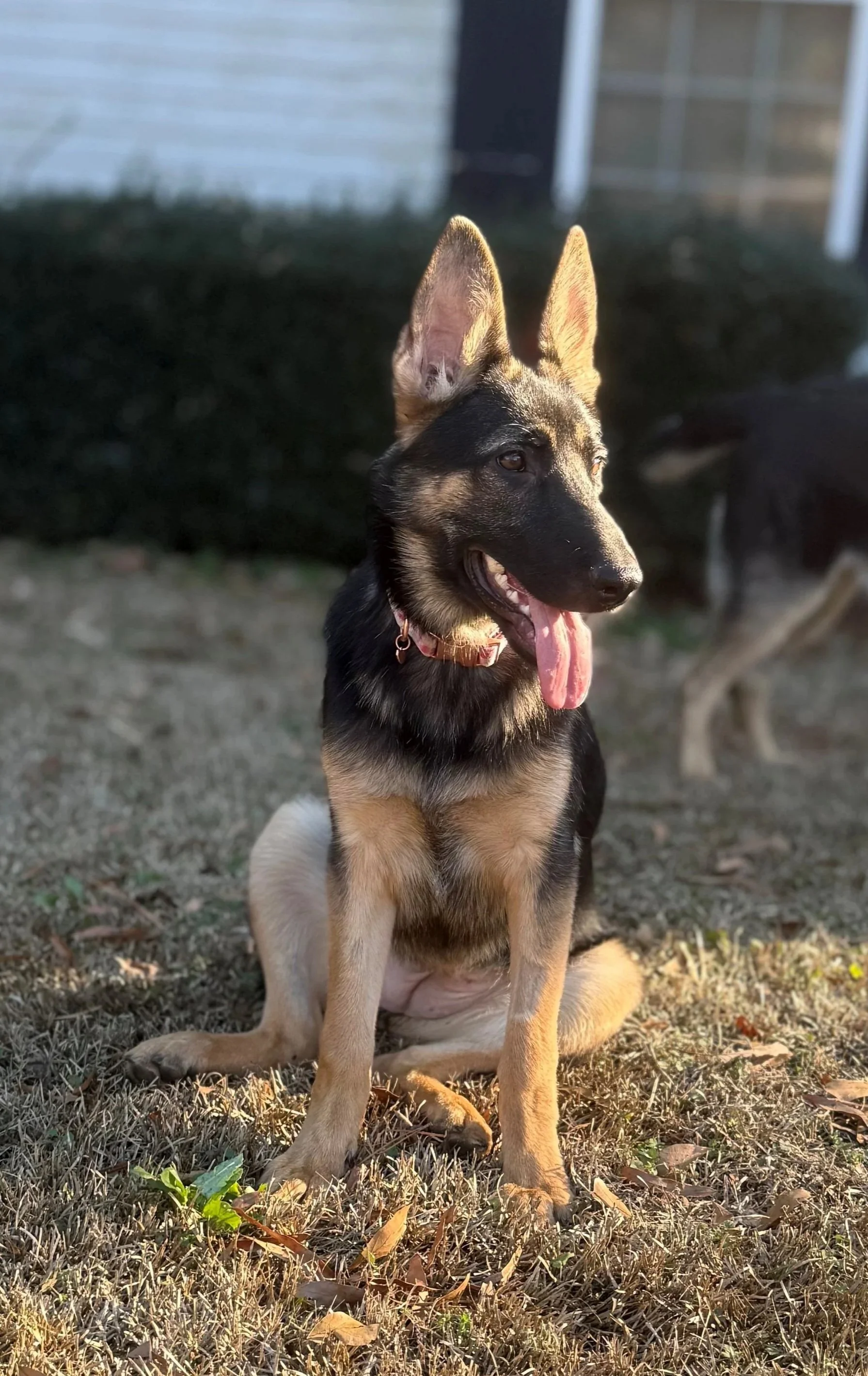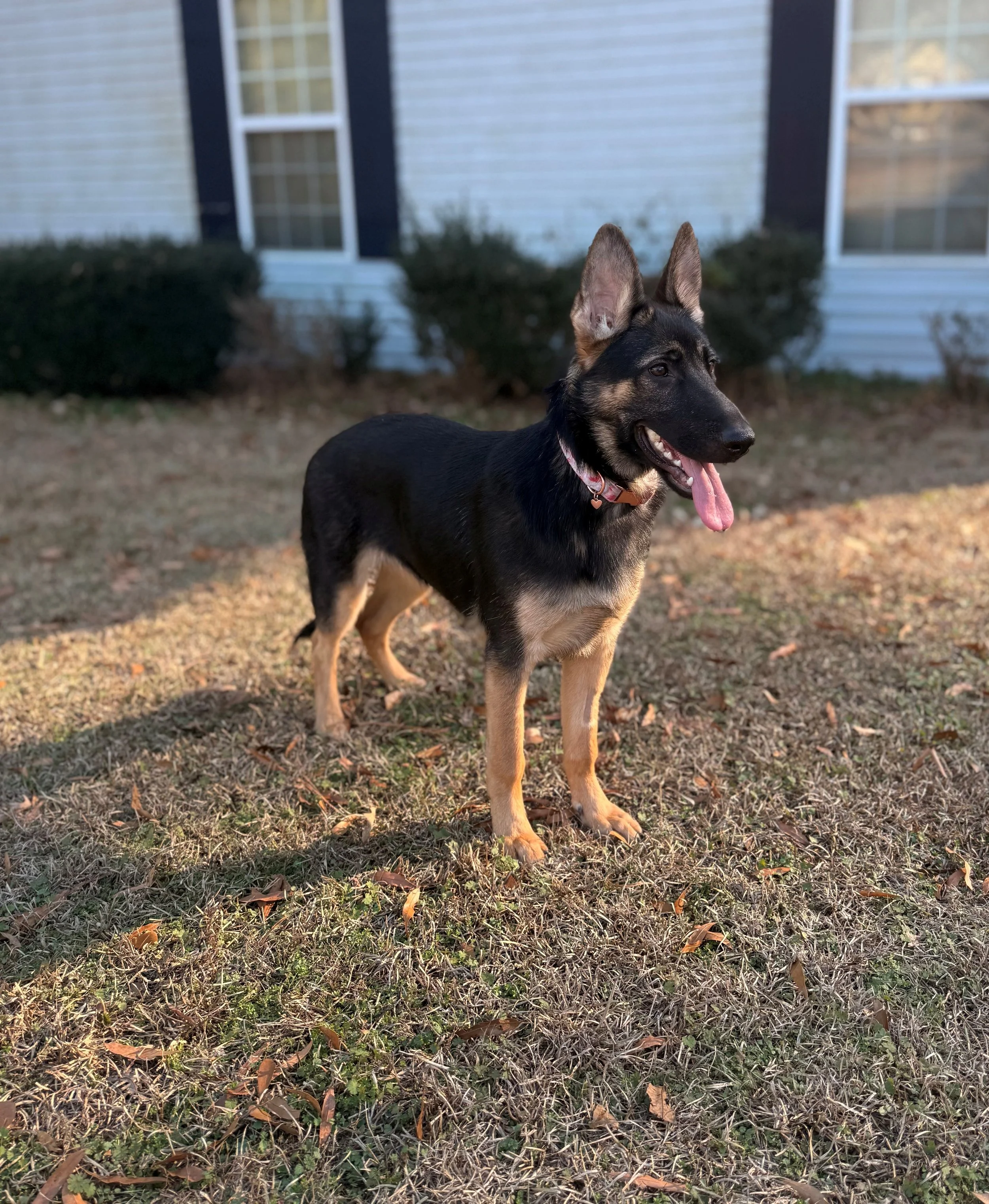 Astrid is thriving at 8 months old, embracing her playful and curious nature. She's highly intelligent and quickly learning essential skills like house manners, leash walking, and basic commands. Astrid adores interacting with her foster sister, a 5-year-old GSD, and respectfully listens to her foster kitty brother's boundaries.